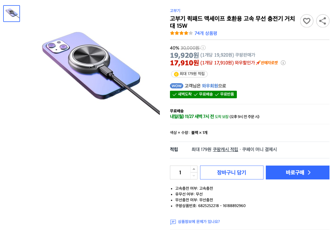 이거 샀다. 케이블을 연결해서 사용할 수 있는 맥세이프 무선 충전기인데 원래는 컴스마트 제품을 사용하고 있었다만