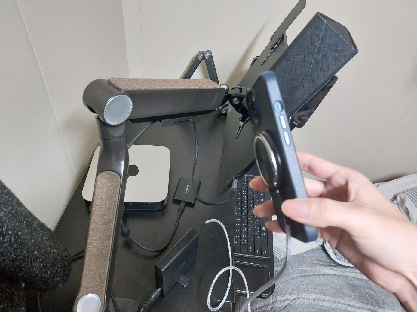 맥세이프 케이스를 사용하는 아이폰 13 정도의 무게라면 사용에 아무런 탈이 없다. 대략 200g 정도 되나.
