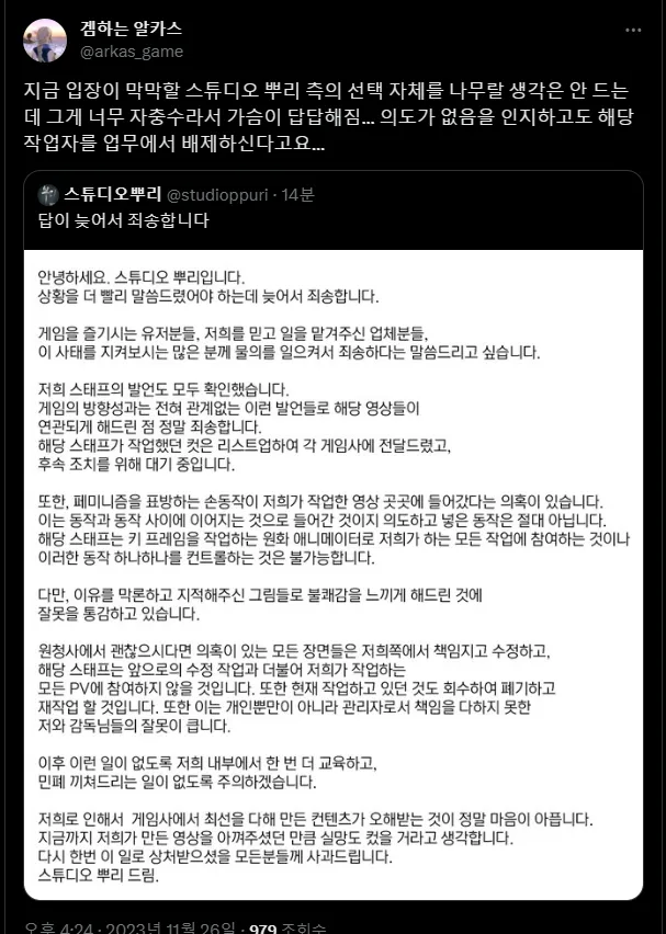 결국 '스튜디오 뿌리'가 정식으로 게재한 사과문은 사과 없이 그저 이 사건을 무마하기 위한 해명문으로 변질