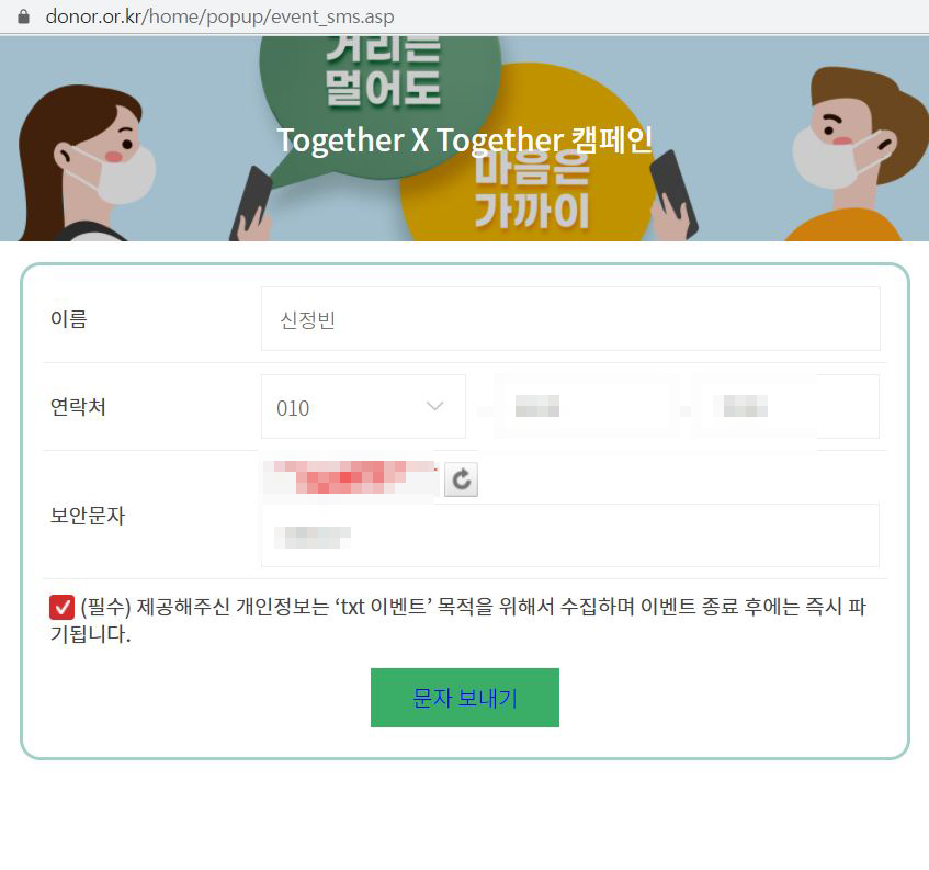 연결되는 링크를 게시했다. 위 링크로 이동해서 이름, 연락처, 보안문자를 입력하면 잠시후 문자가
