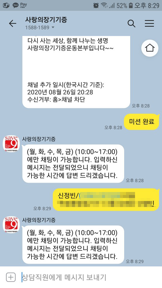 그뒤로는 깨똑 친구 찾기창에서 사랑의장기기증 채널을 추가하고 미션 완료 및 그립톡을 받기