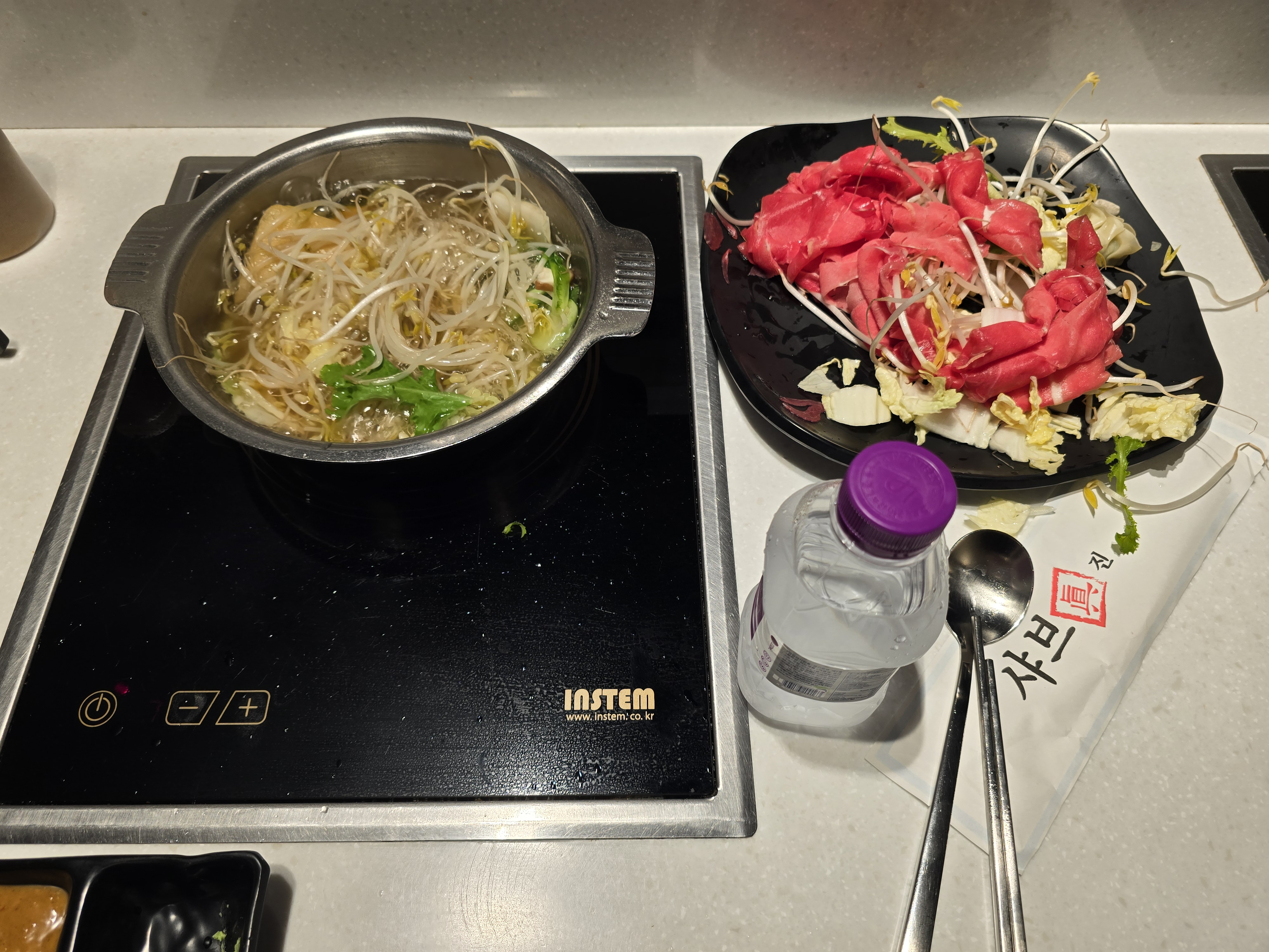 느긋하게 일했군. 일이 끝난 뒤에는 친구랑 1인 샤브샤브 식당에 갔다. 조금 실망스러운 양이었다. 꽤