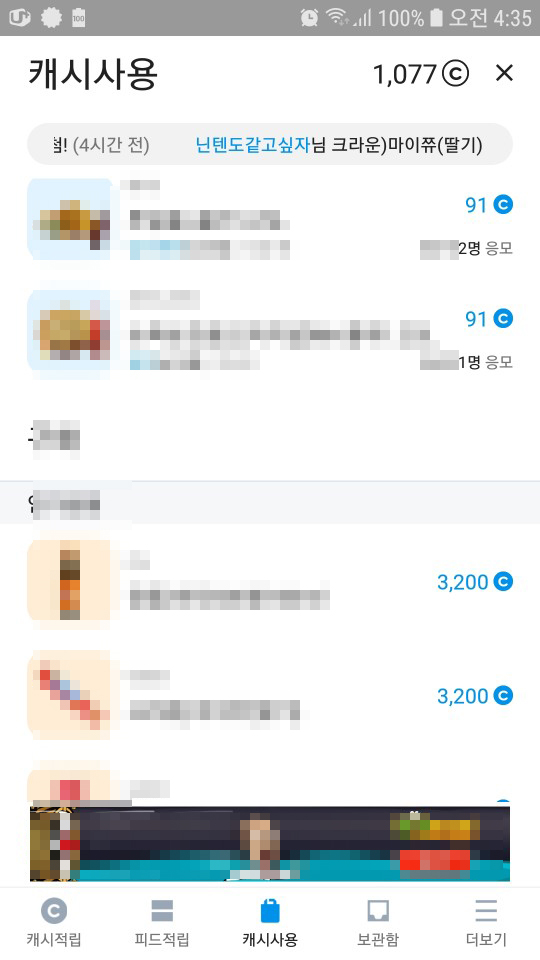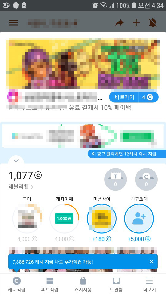 '피드적립' 등에서 더 광고를 보거나 어플 내에서 추천해주는 다양한 프로모션을 진행해서 캐시를
