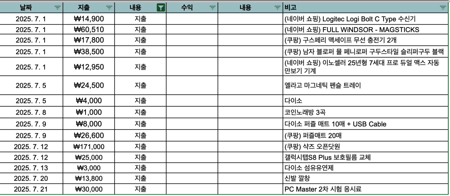 생각이 난 김에 행동에 곧바로 옮기는 게 낫겠지. 그렇게 엄청난 지출이 있지는 않는 달이었다. 8월이 좀 걱정되네.