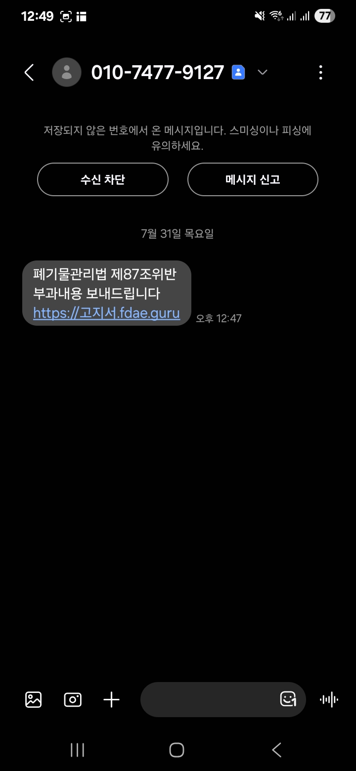 apk 파일 설치를 시도하길래 수상쩍어서 검색해보니 역시 사기였다. 진짜 빡치게 만드네. 와중에 스팸 문자 등록