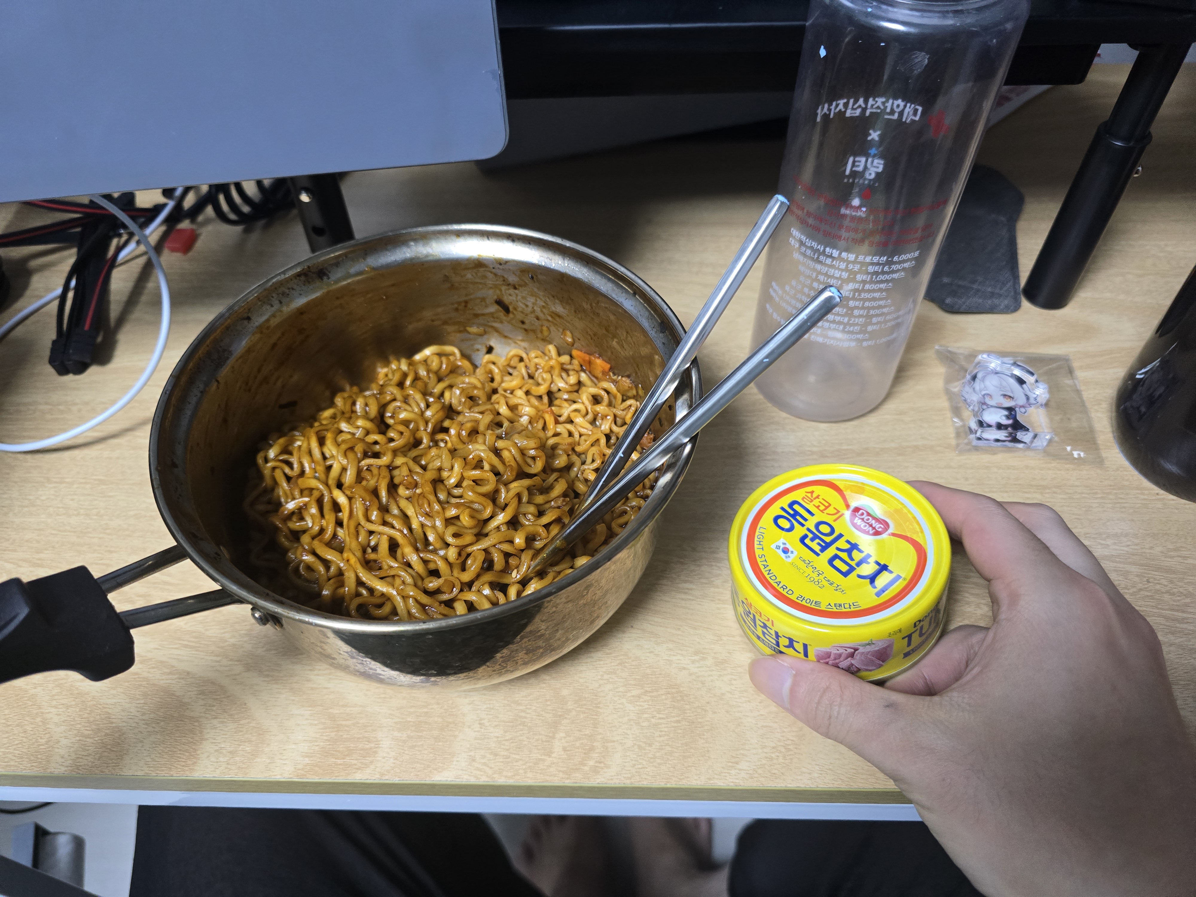 일요일 저녁 21시 30분이 되어서 귀가했다. 저녁을 못먹었으니 집에 있는 짜파게티와 불닭볶음면 섞어서 먹었다. 수분