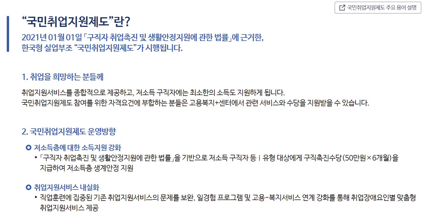 실업급여 제도가 퇴직 후 재취직을 하려는 사람에 대한 지원이라면 국민 취업 지원제도를 통해