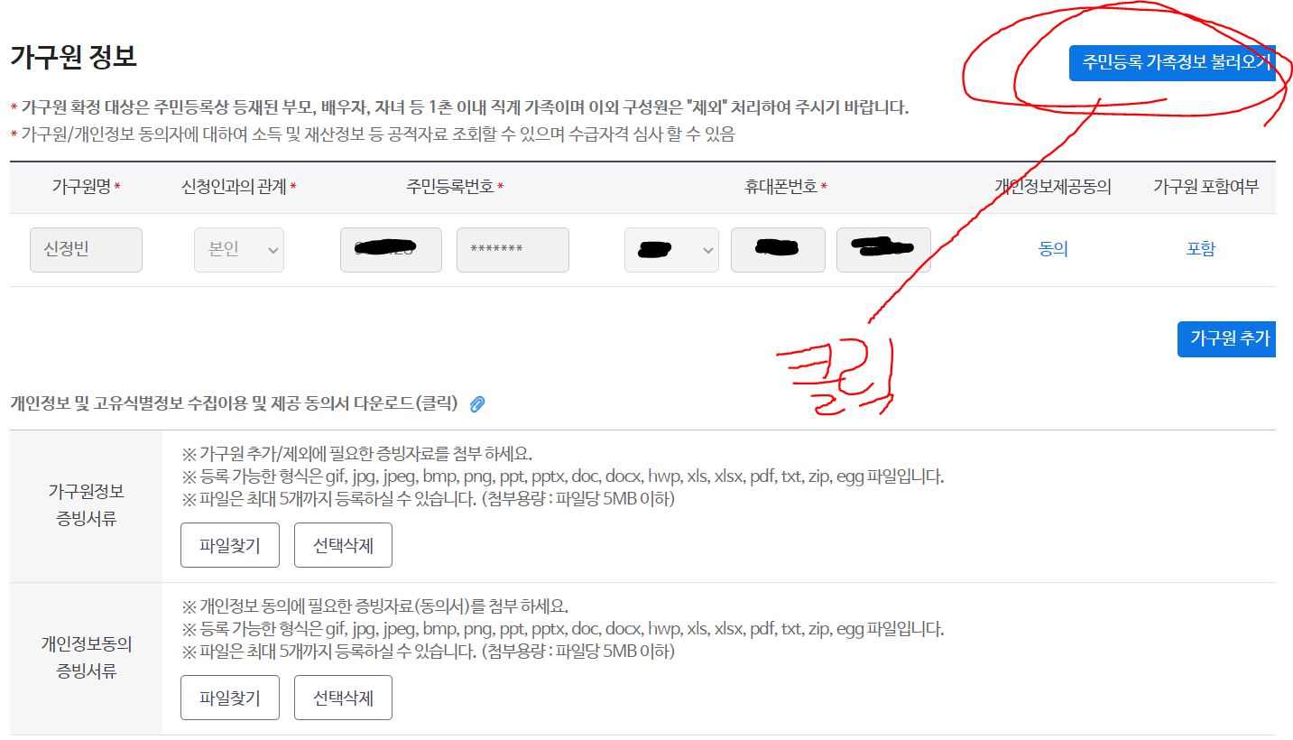 이후에는 '주민등록 가족정보' 불러오기란 버튼을 클릭만 하면 정부 홈페이지와 아름답게