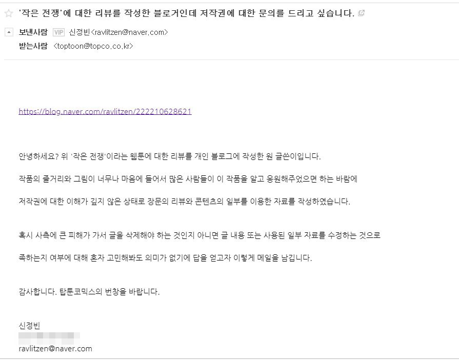 나 : 그쪽 작품을 좀 재미있게 보아서 사람들이 많이 알아줬으면 하는 마음에 글을 써봤습니다.