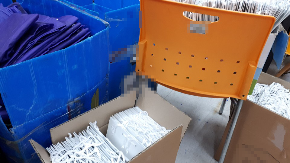 수영복을 네 개의 상자에 여아용 25개, 남아용 25개 총 50개씩 담는 작업을 행했고 여 봉사자