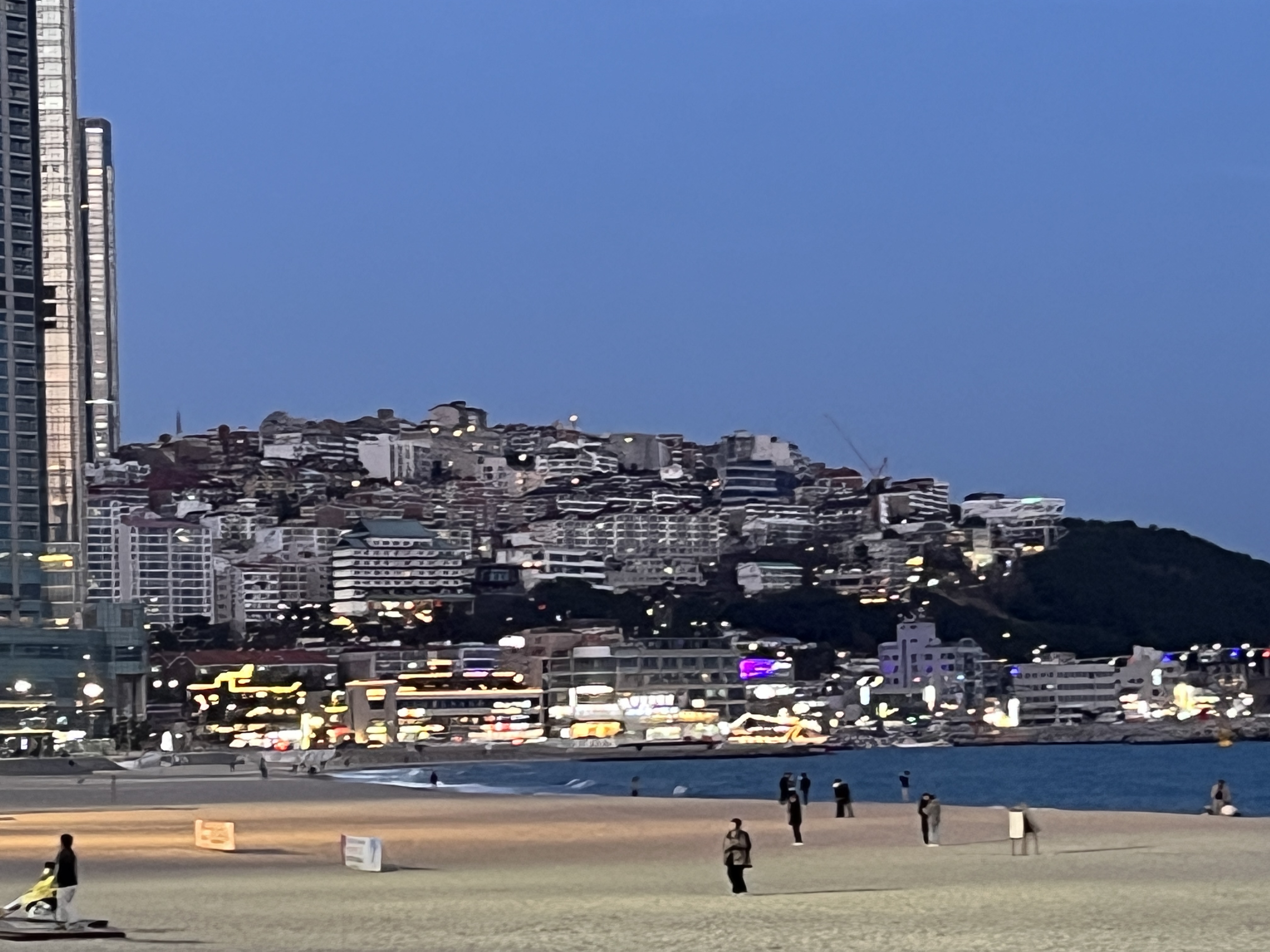 해운대의 끝을 찍고 다시 돌아오는 길에는 꽤나 야경이 예뻐서 사진을 찍었다. 도시의 불빛을 받아 밤바다는 어쩐지
