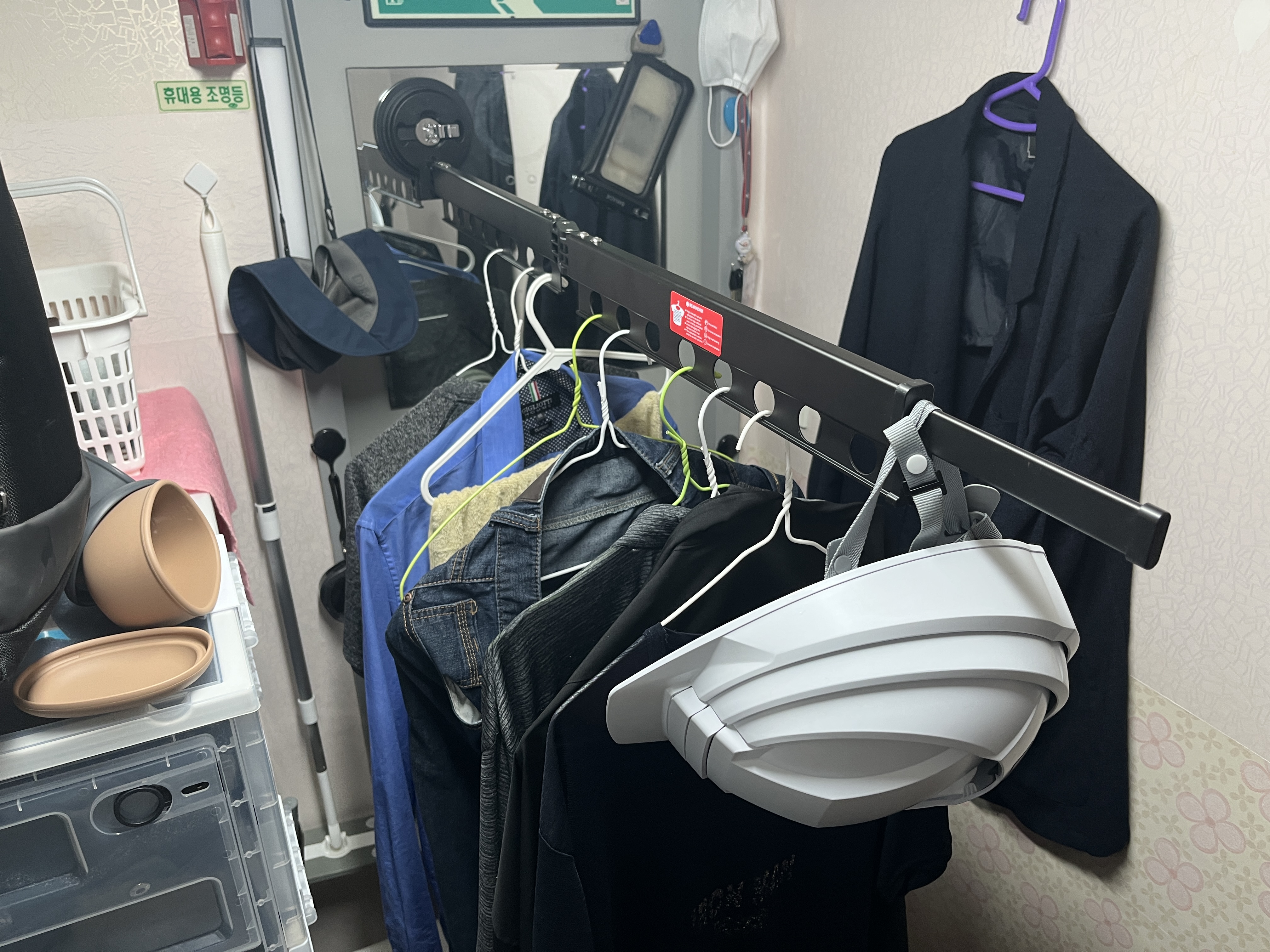 벽에 나름대로 잘 붙는 것까진 좋았는데 설치하고 빨래물을 걸어둔 다음 막상 생활해보니 출입할 때 매우 불편하더라.