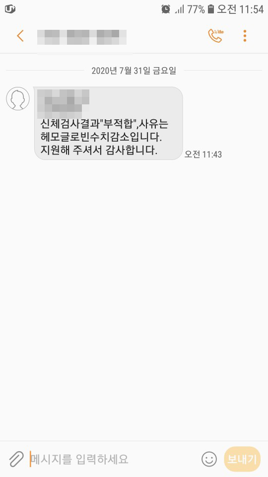 검사받은 다음날 헤모글로빈 수치 감소로 불합격 통보를 받았다. 하긴 헌혈하러 갈 때도 신체 검사