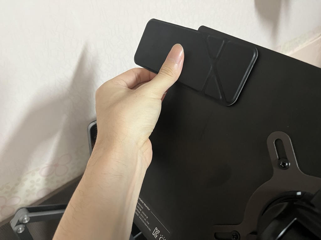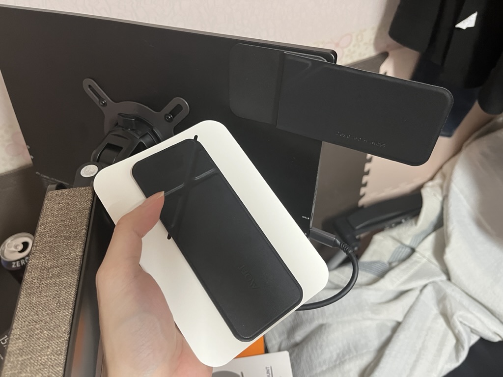 모니터의 꼭지점에다가 거치하는 식으로 사용하는 거 같던데. 환상이었나. 아무튼 기기랑 모니터가 딱 붙도록 하는